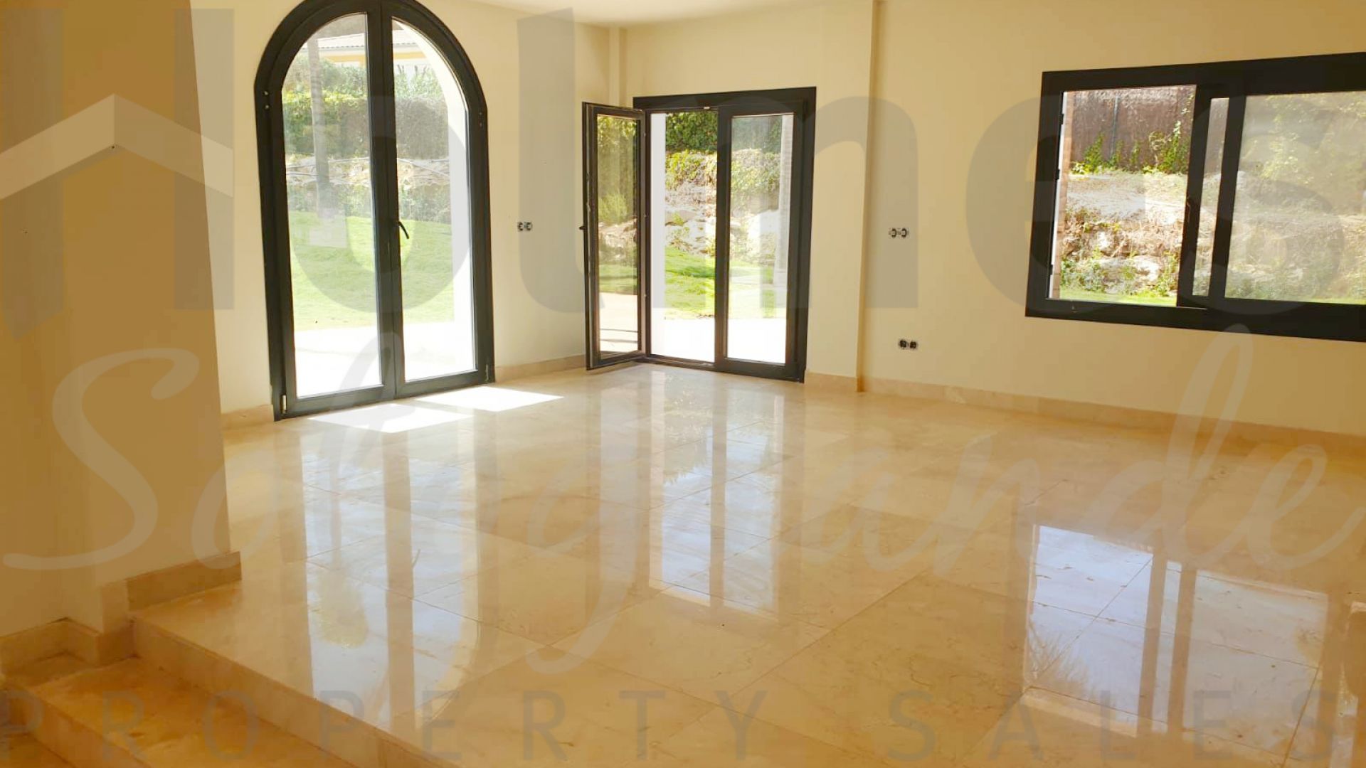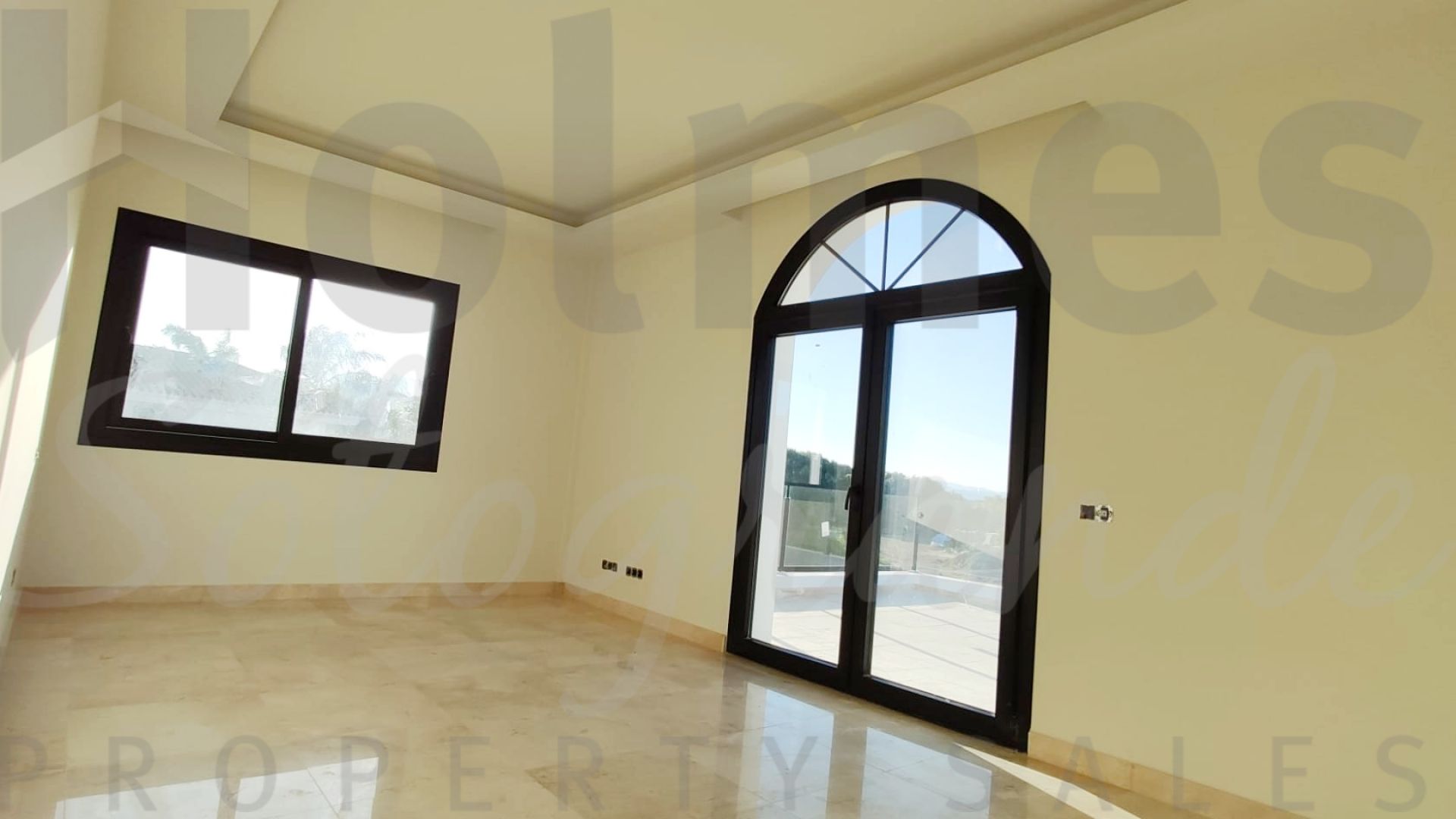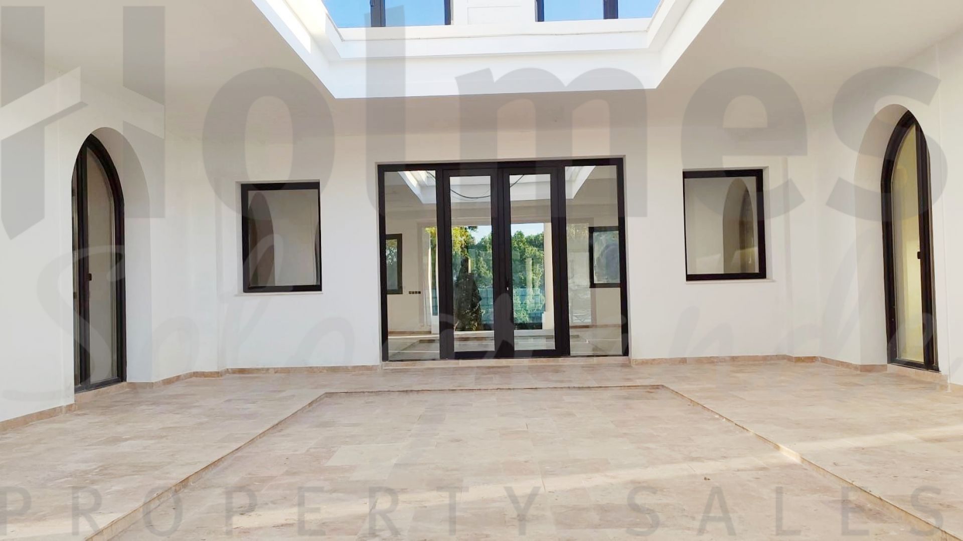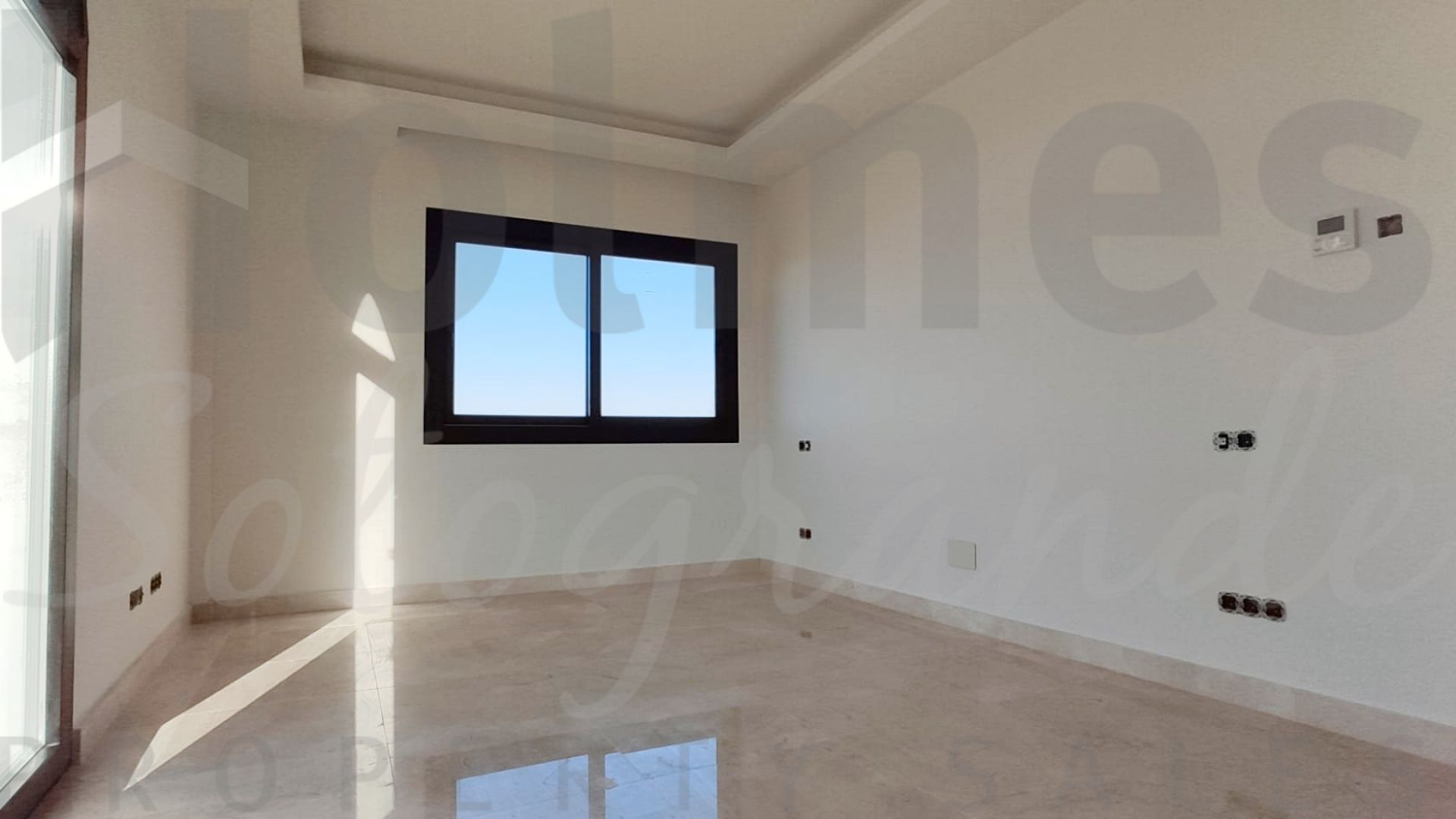 The villa boasts high-quality finishes, including 60x60 Coto Marfil marble and Roman Travertine in a French pattern for flooring, coffered ceilings, and ivory white paintwork. The master bedroom is designed with a vaulted two-pitched ceiling. It is also equipped with solar energy and air conditioning for both cooling and heating.