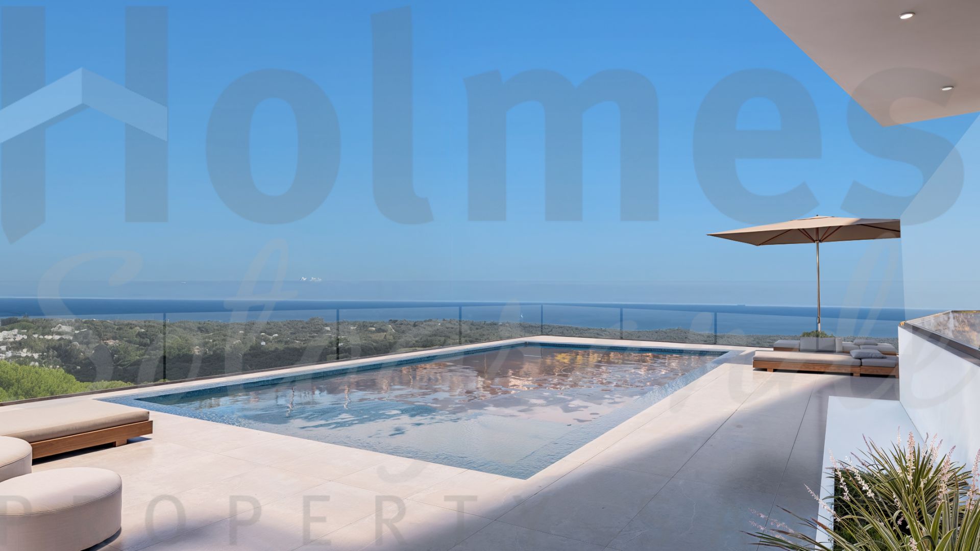 A superb villa built on an elevated site with outstanding panoramic views over golf courses to mountains and the sea.